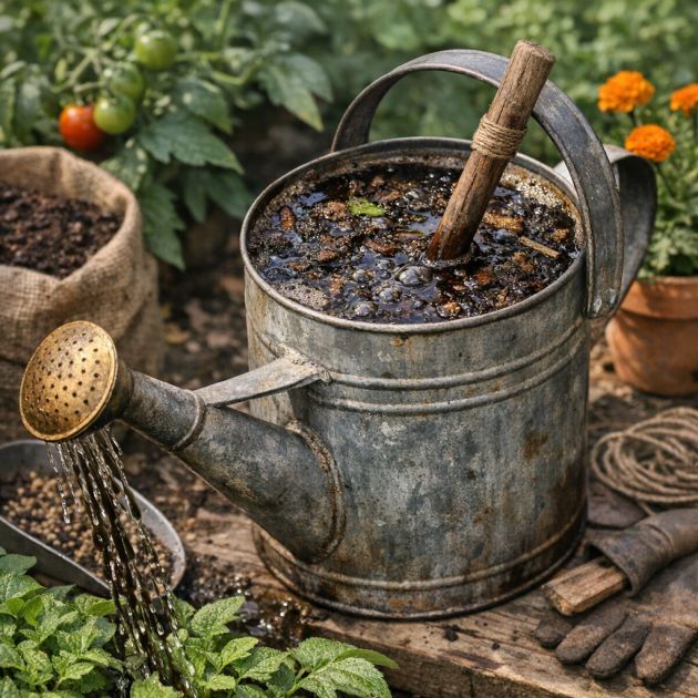 Once ready, use the can to water your garden, providing plants with a nutrient-rich boost. This simple method of making compost tea helps enrich the soil and promotes healthy plant growth without the need for chemical fertilizers.