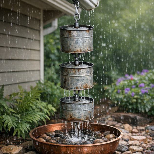 Hang the can from an existing gutter or eave, allowing rainwater to flow through the chain and into a collection basin or garden bed below. This eco-friendly solution not only manages rainwater but also adds a visual element to your home’s exterior.