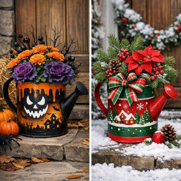 Repurpose watering cans as seasonal décor by painting them with festive designs or wrapping them in decorative ribbons. For Halloween, paint the can in spooky colors and fill it with autumnal plants like mums or ornamental kale.