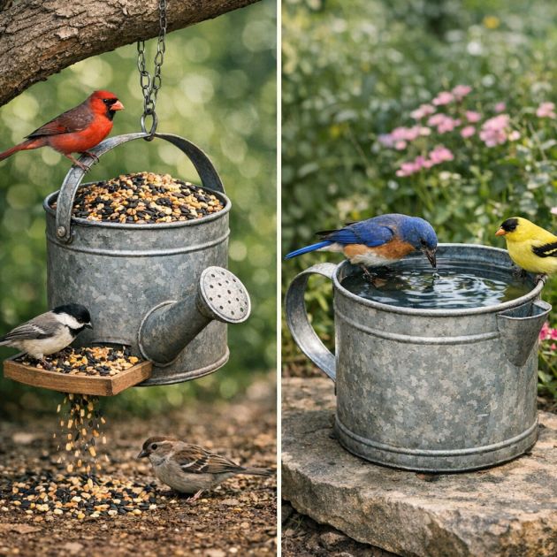 Transform watering cans into bird-friendly features by repurposing them as feeders or baths. For a bird feeder, fill the can with birdseed and hang it from a tree branch, allowing the spout to dispense seed onto a platform or directly onto the ground.