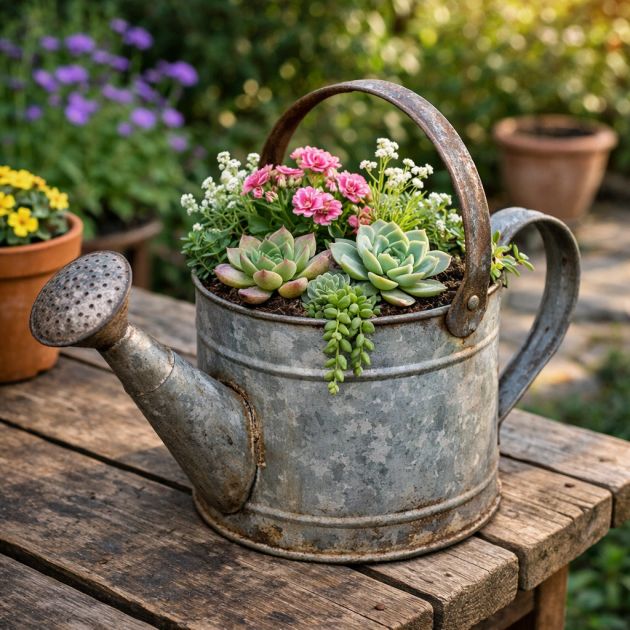 1. Transform Old Watering Cans Into Charming Planters