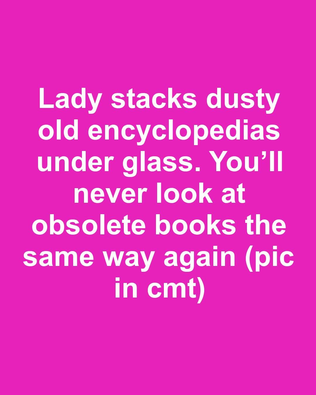 Lady stacks dusty old encyclopedias under glass. You’ll never look at obsolete books the same way again