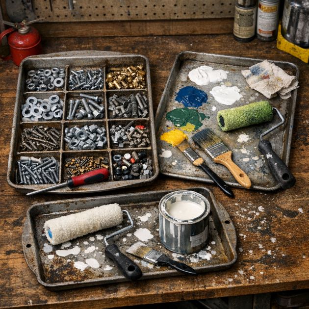 In the garage or workshop, old baking sheets serve as perfect organizers for small parts, nuts, and bolts. Their shallow design allows for easy access while keeping items contained. When working on paint projects, use the sheets as palettes or to rest brushes and rollers between uses. They can also be used to catch drips and spills, protecting surfaces from paint stains. By incorporating baking sheets into your DIY workspace, you can enhance organization and efficiency, making your projects more enjoyable.