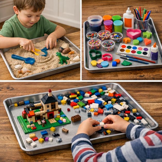 Repurpose baking sheets into play trays that keep kids’ activities contained and organized. For sensory play, fill the tray with sand, rice, or beans, allowing children to explore textures and practice fine motor skills. For crafting, the tray can hold art supplies, beads, or clay, preventing messes from spreading. When it comes to Lego building, the tray’s edges help keep pieces from rolling away. This simple solution is both practical and fun, encouraging creativity and reducing cleanup time.