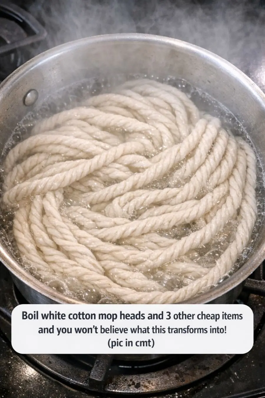 Boil the white cotton mop heads in a large pot of water on the stove for 15-20 minutes to soften the fibers and remove any impurities.