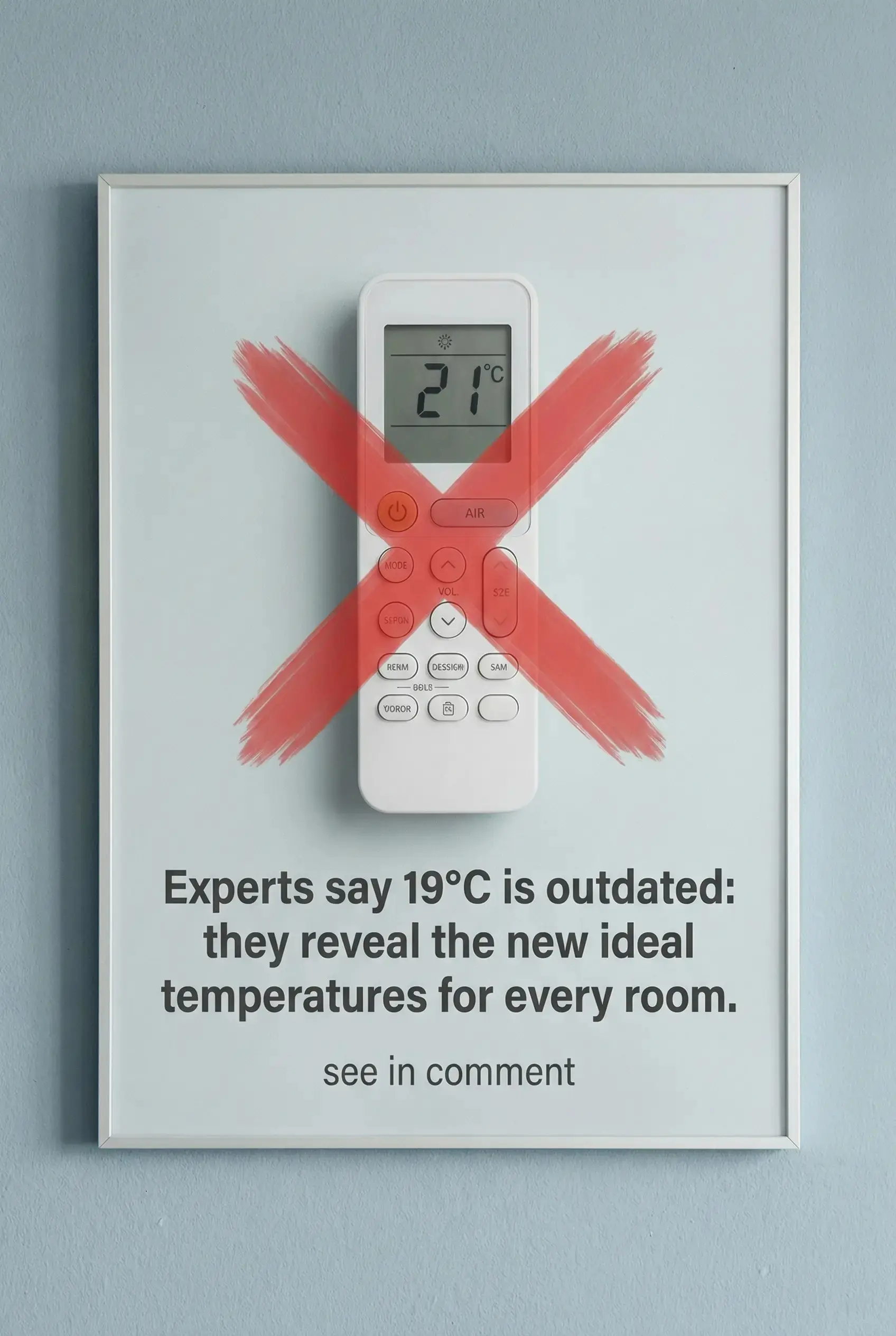 The image highlights this shift: a thermostat set to 19.3°C marked with a red “X,” symbolizing that this old standard may no longer be ideal.