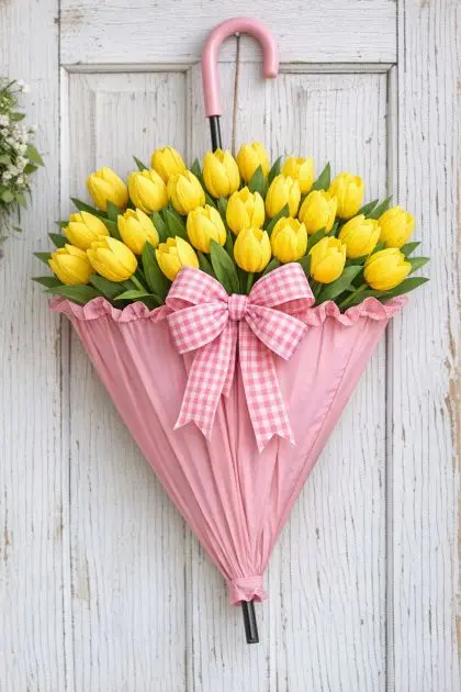 This DIY hanging bouquet is best styled in a home that embraces vintage or shabby chic aesthetics. Pair the bright faux yellow tulips with soft pastel hues around your entryway, such as a pale blue or mint green door mat or a soft pink wreath. Consider using other vintage elements like a distressed wooden bench or wrought iron accents nearby to complement the umbrella’s nostalgic charm.