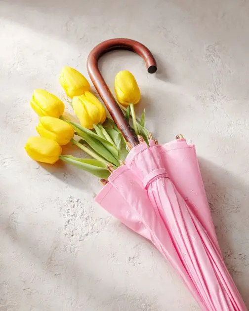 Secure the tulips in place by tying a decorative ribbon around the umbrella handle and stalks of the flowers, creating a bow for added charm.