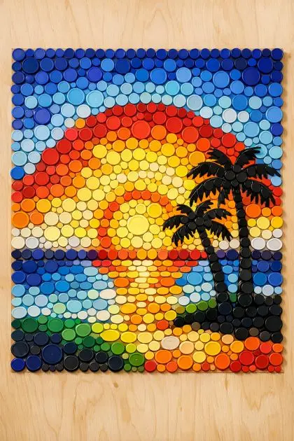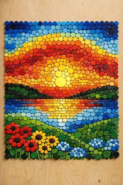 Upcycling has become a popular trend, and this innovative project is a perfect example of turning everyday waste into a stunning piece of art. By arranging bright, multi-colored plastic lids on a smooth plywood panel, you can create a vibrant DIY mosaic wall art that’s not only eco-friendly but also a unique conversation piece for your home. This project is perfect for anyone looking to add a splash of color to their interior decor while contributing to sustainability.