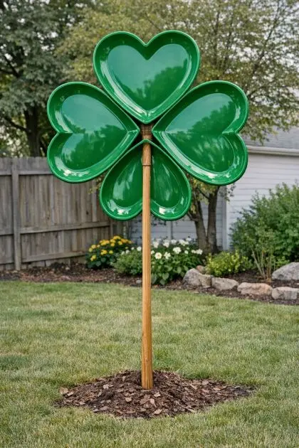 Create an eye-catching piece of yard decor with this DIY giant lucky clover project. Perfect for St. Patrick’s Day or any time you want to add a touch of whimsy and luck to your outdoor space, this project is simple yet impactful. By using everyday items like green plastic heart-shaped serving trays and a wooden broomstick, you can craft a large clover that will have neighbors intrigued and asking about your creative front yard display.