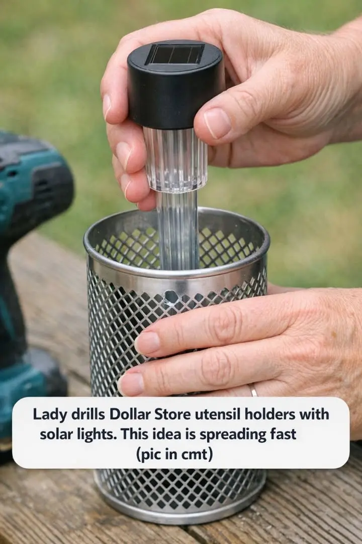 Lady drills Dollar Store utensil holders with solar lights. This idea is spreading fast