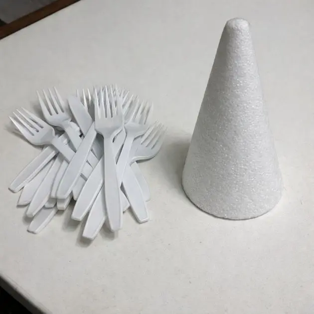 Beginning at the bottom of the styrofoam cone, insert the fork heads into the cone. Ensure the forks are slightly angled upwards to mimic the appearance of leaves on a tree.