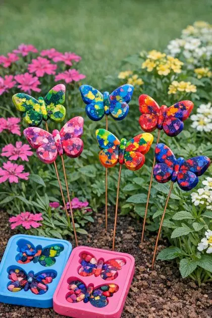These DIY butterfly garden stakes are perfect for adding a touch of color and whimsy to any outdoor space. They can be placed among flowers in a garden bed, lined along a pathway, or even used in potted plants on a patio. The colorful butterflies provide a playful contrast against greenery and are especially striking when the sun catches them, bringing out the rich hues of the melted crayons. For a cohesive look, consider grouping them in odd numbers or pairing them with other natural elements like stones or wooden planters.