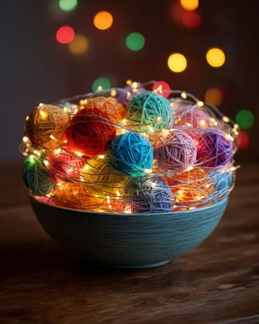 Insert the battery-operated string lights into the yarn bowl, arranging them so that they are evenly distributed.