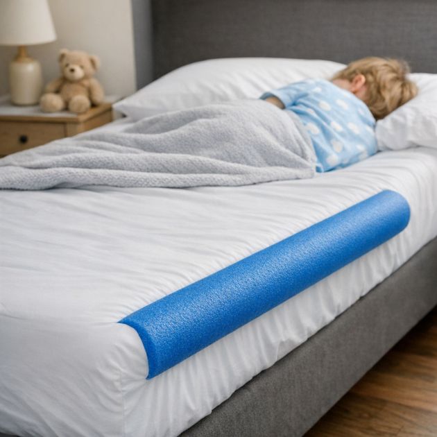 For parents worried about their little ones rolling out of bed, pool noodles can be a simple and safe solution. Place a pool noodle under the fitted sheet, positioned along the edge of the bed. This creates a soft barrier that helps prevent falls. You can cut the noodle to fit the length of the bed and secure it in place with the fitted sheet. It’s an inexpensive way to ensure a safe sleeping environment and can be removed easily when not needed.