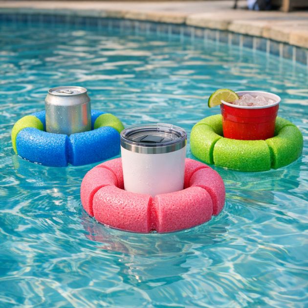 Enhance your pool experience by crafting floating beverage holders with pool noodles. Cut a noodle into smaller pieces, about 6 inches each, and use waterproof adhesive to form a circle. Leave a gap in the center for a cup or can. These floating holders can be customized with different colors and are perfect for keeping your drink within arm’s reach while you relax in the pool. They are reusable and can be stored easily for next summer.