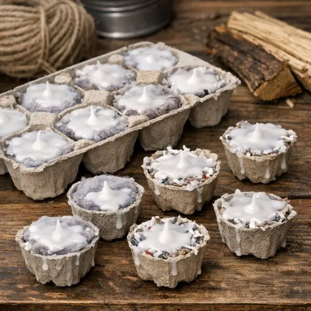 Create fire starters by filling egg carton cups with dryer lint or shredded paper, and then pouring melted wax over the top. Allow the wax to cool and harden before cutting the cups apart. Each individual cup can serve as a fire starter, making it easy to ignite your campfire or fireplace.