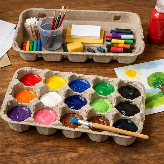Cardboard egg cartons can be converted into paint palettes by cutting off the lid and using the bottom section. Each cup can hold a different color of paint, making it easy for kids to mix and create their masterpieces. Additionally, the lid can be used as a tray to keep art supplies organized during craft time.