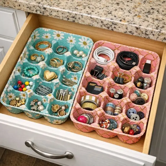 Transform egg cartons into drawer organizers by cutting them to fit the dimensions of your drawers. Each cup can hold small items like jewelry, office supplies, or electronic cords. For a standard kitchen drawer, you might use two egg carton tops laid side-by-side, or trim them to fit smaller spaces.