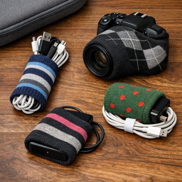 Tangled cords and unprotected tech gear can be a hassle. Mismatched socks can be upcycled into organizers and protectors. Cut the toe off a sock and use the tube to bundle cords together neatly, preventing tangles and keeping your space tidy.