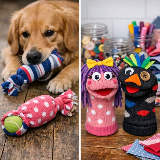 Transform mismatched socks into fun DIY toys for pets and kids. For a quick pet toy, stuff a sock with crinkly paper or an old tennis ball, then tie a knot at the open end. This makes a perfect chew toy for dogs, providing entertainment and comfort.