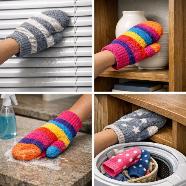 Mismatched socks can be transformed effortlessly into dusting and cleaning mitts. Simply slip a sock over your hand and use it to dust surfaces like countertops, blinds, and shelves. The soft material is perfect for attracting dust and dirt, making cleaning faster and more efficient.