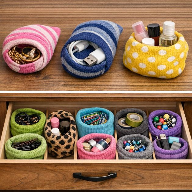 In drawers, use socks to separate and organize small items like accessories or office supplies. This keeps your drawers tidy and makes finding items easier. These sock pouches are easy to make and a great way to upcycle old socks.