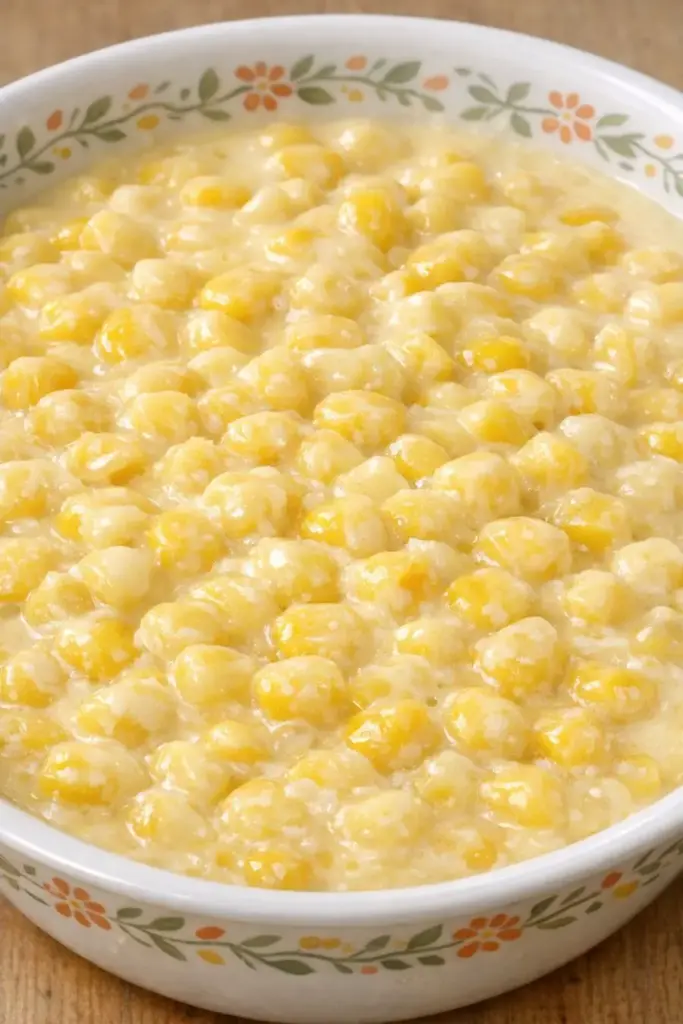 Serve this creamed corn warm in a favorite patterned serving bowl alongside roast chicken, meatloaf, ham, or grilled pork chops. It’s wonderful with mashed potatoes, green beans, or a simple salad to balance the richness. For a bigger family spread, pair it with cornbread or dinner rolls to soak up the buttery cream sauce. Leftovers reheat nicely and can be spooned over baked potatoes or rice for an easy next-day side.