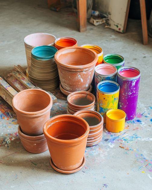 Paint each pot in your chosen bright colors, allowing each coat to dry completely before applying another. You may need 2-3 coats for vibrant coverage.