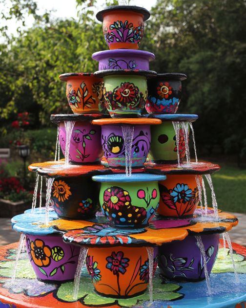 This painted terra cotta pot fountain can be styled to complement a variety of backyard themes. For a bohemian look, consider using bright, eclectic colors and patterns. If your backyard has a more modern aesthetic, opt for sleek, monochromatic tones. Surround the fountain with lush greenery or colorful flowers to enhance its visual appeal. Incorporate outdoor lighting to highlight the fountain at night, creating a magical ambiance.