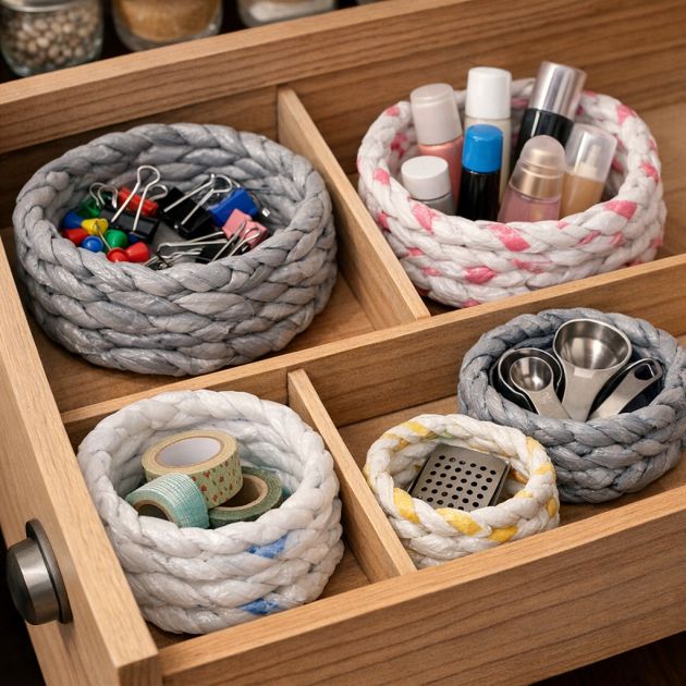 Create custom organizers for drawers, shelves, and bins using plastic bags. Twist the bags into ropes and coil them into circles, securing with hot glue to form small baskets or dividers.