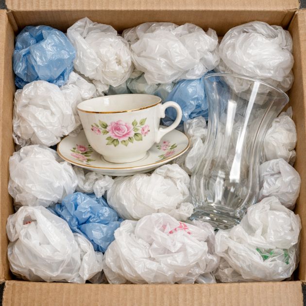Instead of purchasing bubble wrap or packing peanuts, use plastic bags as a cushioning material for shipping and storage. Crumple each bag into a loose ball and place them around fragile items in boxes to provide padding.