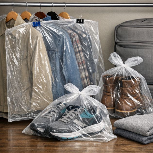 For clothing, use larger bags or cut the sides of smaller ones to create a flat sheet, then drape over garments on hangers. Secure with clips or tape to keep them in place. This method protects your items without the need for expensive garment bags.