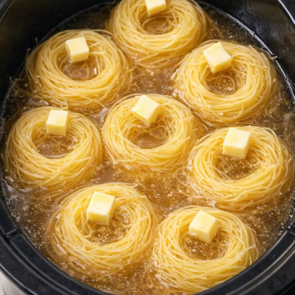 Arrange the dry angel hair pasta nests in a single layer on the bottom of the slow cooker. It’s fine if they overlap a bit, but try to keep them mostly flat so they cook evenly.