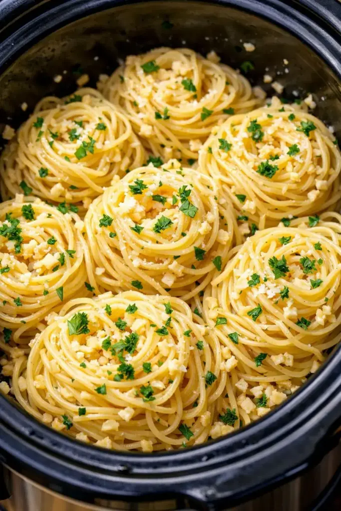 Serve these slow cooker garlic noodles straight from the crock on warm, with a big tossed salad or some steamed green beans to brighten up the plate. Garlic bread or simple buttered toast is wonderful for sopping up any extra buttery sauce. If you want to make it feel a little more special, sprinkle on some dried parsley or a pinch of red pepper flakes at the table. A side of rotisserie chicken, grilled sausages, or leftover roast makes this a complete, stick-to-your-ribs dinner without much extra effort.