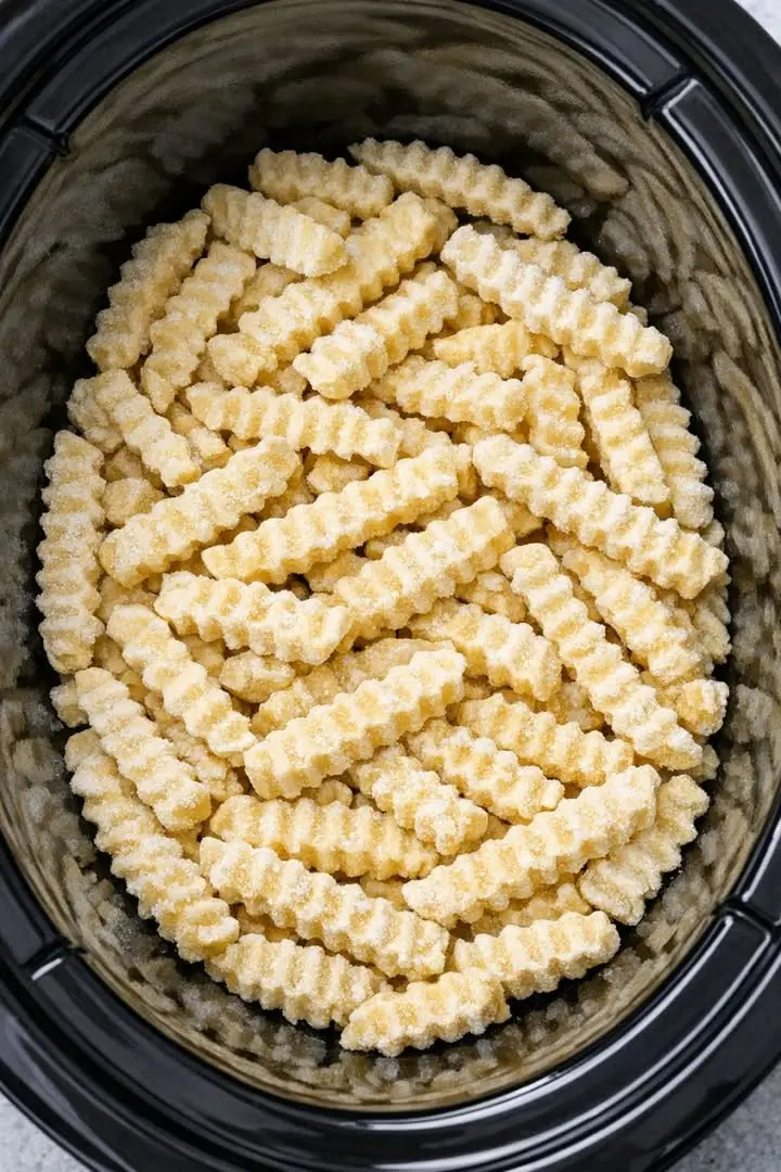 Pour the frozen crinkle cut fries into the bottom of the slow cooker and spread them into an even layer. They should be fully frozen when they go in.