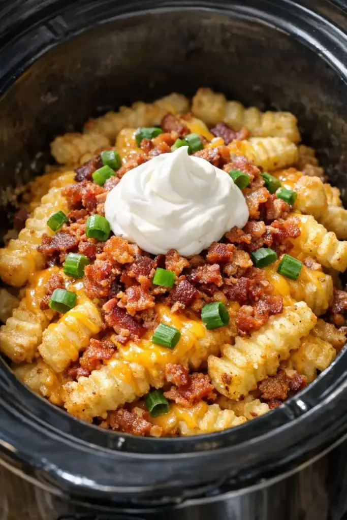 You can swap the condensed cream of chicken soup for cream of mushroom or cream of celery to keep it meatless, or use a reduced-sodium version if you’re watching salt. For extra flavor, stir 1/2 teaspoon garlic powder, 1/2 teaspoon onion powder, or a pinch of smoked paprika into the soup and sour cream mixture before pouring it over the fries. If you’d like more protein, fold in 1 to 1 1/2 cups of diced cooked ham or shredded rotisserie chicken along with the bacon. To make it vegetarian, skip the bacon and use cream of mushroom soup, then add a handful of sliced green onions for a fresh bite at the end. You can also use a cheese blend like Colby Jack or pepper jack for a different flavor. For food safety, always start with fully cooked bacon (never add raw bacon to the slow cooker), and keep the fries frozen until you’re ready to assemble so they heat evenly. Make sure the dish reaches a steamy, bubbling hot temperature throughout before serving, and keep the slow cooker on WARM (not OFF) if it will sit out for more than 30–60 minutes during a gathering. Refrigerate leftovers within 2 hours in a shallow container and reheat thoroughly until piping hot before eating.