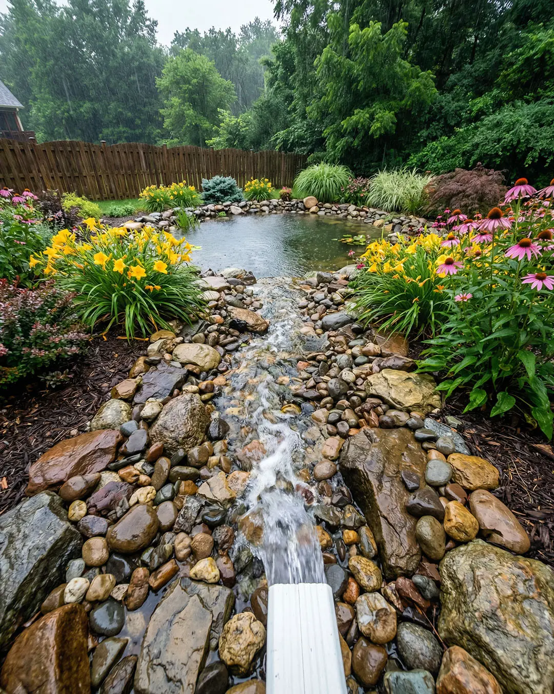 To blend the pond into your yard, you need to soften the rocky edges with moisture-loving plants. As seen in successful designs, use robust perennials like yellow Daylilies and pink Coneflowers (Echinacea) to anchor the banks. These plants have deep root systems that stabilize the soil and prevent the pond edges from collapsing. Place ornamental grasses and ferns in the background to create height and texture, turning your drainage solution into a lush, vibrant garden focal point.