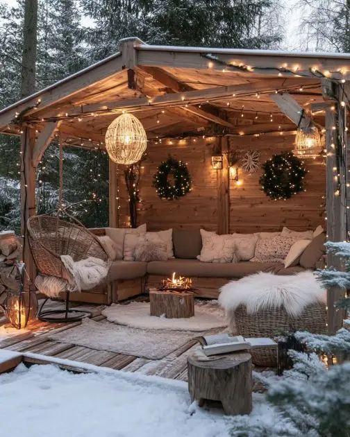 To style your backyard chalet, consider incorporating warm textiles such as wool blankets and faux fur throws to enhance the cozy atmosphere. Use soft, ambient lighting with string lights or lanterns to create a magical evening glow. Add some outdoor rugs and cushions for comfort and to introduce color and texture. Incorporate natural elements like pine cones, branches, and seasonal greenery to blend the chalet with the winter landscape. A fire pit or outdoor heater can also be a great addition to keep the space warm and inviting.
