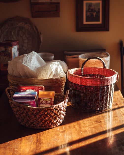 Spray paint the paper towel holder and the two baskets with metallic spray paint. Allow them to dry completely.